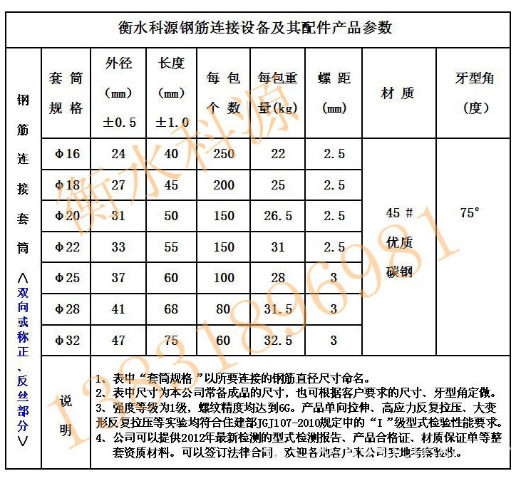 衡水科源鋼筋連接設(shè)備及其配件產(chǎn)品參數(shù)